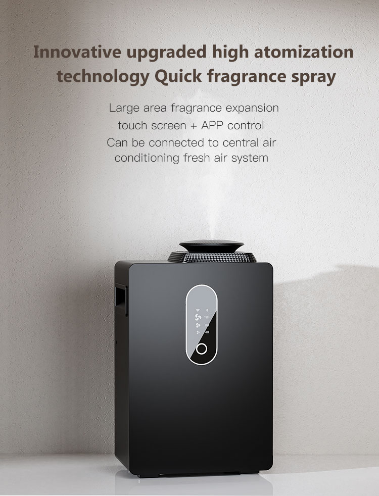 Smart Control Diffuser Q1000PRO принимает технологию двухфлидодной атомизации, чтобы сделать туман таким же маленьким, как микронная частица, что делает запах равномерно распространяться и аромат долгосрочный в пространстве Эта ароматическая машина представляет собой стиль или отдельный стиль на стене, а также может быть подключить систему HVAC для пространства 2000 М метров